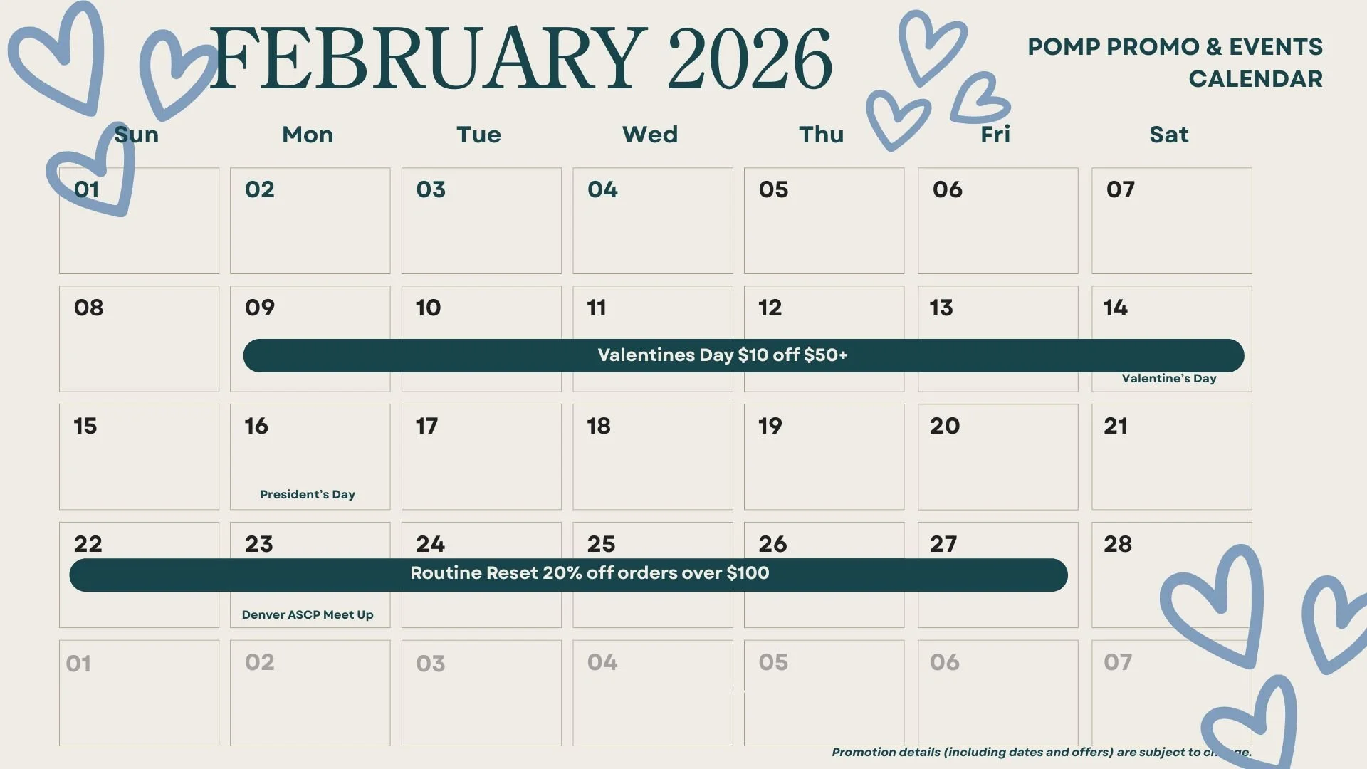 Save our February Pomp Calendar to easily share upcoming promotions with your clients and stay in the loop on educational webinars and events.