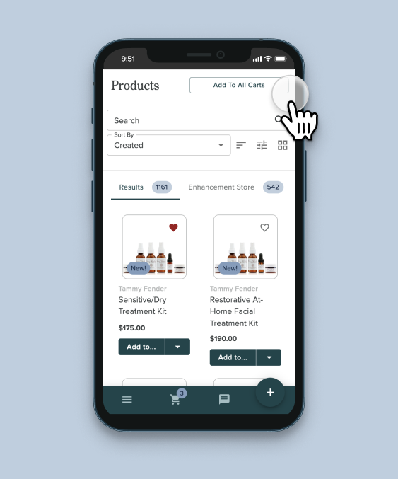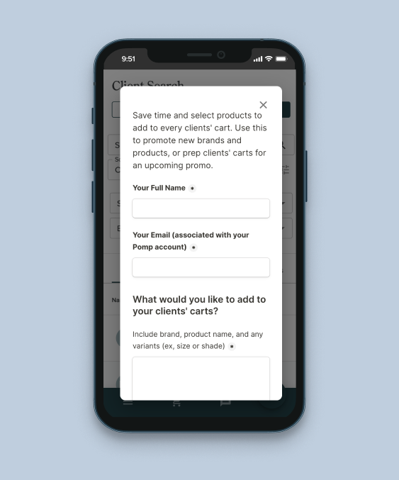 Simply tap “Add To All Carts” from your Client List or Product Search and submit the product(s) you’d like added to your clients’ carts. We also provide the option to have us send a custom message to your clients via your Pomp messaging.